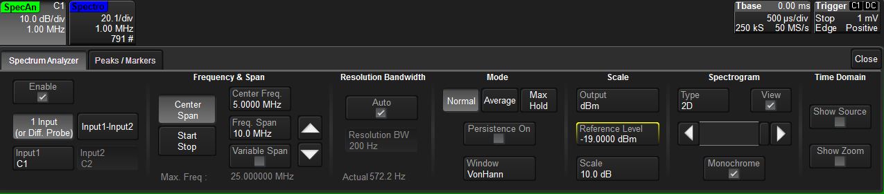 有 Normal、Average 和 Max Hold 三種工作模式。 正常模式顯示源跡線的功率譜。 在平均模式下,用戶可以輸入要平均的光譜數(shù)。 平均可有效降低信號噪聲以查看更多諧波或載波細(xì)節(jié)。 最大(峰值)保持模式對于掃描頻率測量很有用,它顯示了頻率軸上峰值的歷史記錄。 Max Hold 顯示信號達(dá)到的最大電平。 它還可用于查找不常見的雜散。