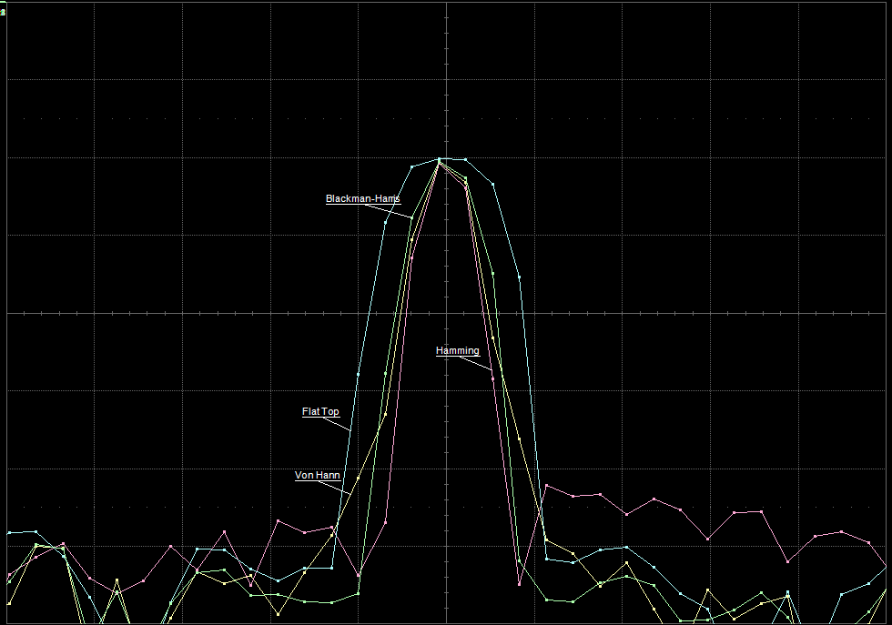 Window 允許用戶指定用于 FFT 的加權(quán)窗口。 選擇是馮·漢恩(Hanning)、漢明、平頂和布萊克曼·哈里斯。 圖 3 顯示了每個可用加權(quán)函數(shù)的頻譜形狀比較