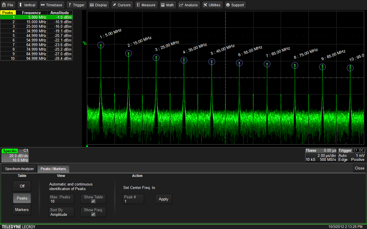 按下 Peaks/Markers 選項(xiàng)卡上的 Peaks 按鈕可以打開自動峰值檢測和標(biāo)記,如圖 5 所示。使用此功能最多可以跟蹤 100 個峰值。 如果選中 Show Table 復(fù)選框,將打開一個表格,顯示 Max Peaks 數(shù)字輸入字段中請求的峰數(shù)。 表中的峰可以按排序依據(jù)字段中選擇的頻率或振幅排序。 峰通常按表中所示的峰編號列出。 選中 Show Freq 框?qū)槊總€峰添加頻率讀數(shù)。