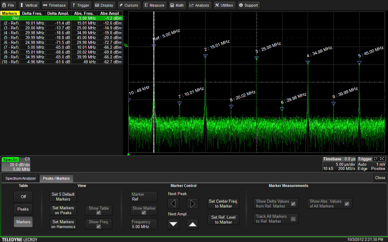 頻譜分析儀選項(xiàng)能夠添加多達(dá) 20 個用戶設(shè)置的標(biāo)記。 在如圖 6 所示的 Peak/Markers 對話框中按 Markers 按鈕可以訪問 Marker 控件。標(biāo)記在頻譜顯示中顯示為藍(lán)色倒三角形。 標(biāo)記頻率位置和振幅總結(jié)在附表中。