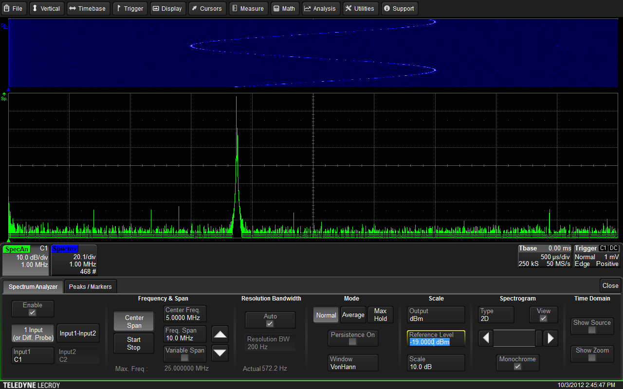 頻譜分析儀選項(xiàng)的主要控制是中心頻率和跨度,就像射頻頻譜分析儀一樣。 Center 和 Span 類似于調(diào)整 FFT 跡線的位置。 每個設(shè)置的值都可以通過屏幕鍵盤輕松輸入。 用戶界面報告可以觀察到的最大頻率,這是當(dāng)前示波器采樣的二分之一。