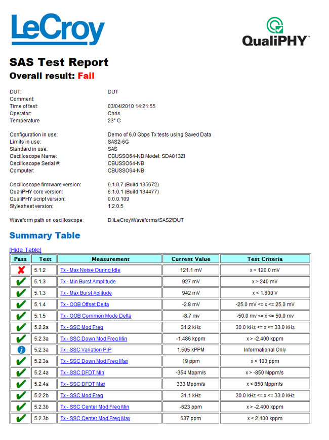 測量結果通常需要匯總并制成表格以快速驗證規格。 此信息連同儀器和信號采集/測試條件設置,形成完整的文檔記錄。 QPHY-SAS2 通過合并一個自動 HTML 報告生成引擎簡化了這個過程。 創建的測試報告包含每個單獨測試結果的表格數值,包括通過/失敗和規格限制列。 報告也可以保存為 PDF、HTML 或 XML格式。