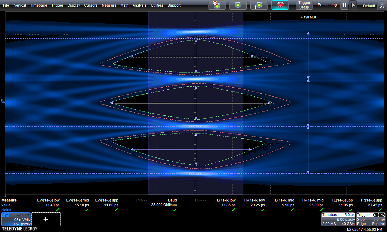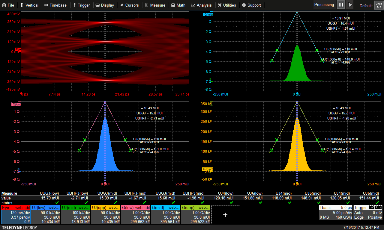 雖然抖動測量已成為幾乎所有高速串行發(fā)射機(jī)測試的既定部分,但基于 PAM4 的信號技術(shù)需要一種新的抖動分析方法。 QPHY-56G-PAM4 從每個上眼、中眼和下眼的采集信號波形中提取不相關(guān)抖動 (UJ) 分布。 從那里,它計算標(biāo)準(zhǔn)所需的抖動參數(shù):不相關(guān)無界高斯抖動 (UUGJ)、不相關(guān)無界高概率抖動 (UBHPJ) 和奇偶抖動 (EOJ)。