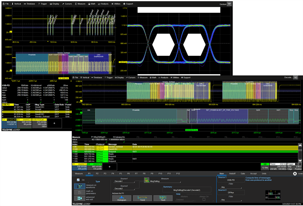 USB-PD TDMP(觸發、解碼、測量/圖形和物理層)提供對 USB-PD 數據包的觸發和解碼。 USB-PD 電源合同是連接兩個 USB Type-C 設備時首先協商的內容。 可以使用 DP-AUX DMP(解碼、測量/圖形和物理層)對 DisplayPort“交替模式”進行解碼,以調試時序問題。 USB-PD TDMP 和 DP-AUX DMP 還提供物理層測量,可用于驗證每個邊帶信號是否符合規范。