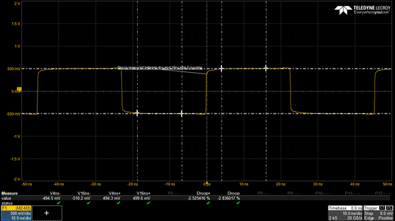 執行Droop測試以確保發射機輸出和 MDI 輸出(連接器)之間沒有發生過度濾波。 在測量初始過零后 4 ns 的電壓 (Vinit) 和過零后 16 ns 的電壓 (Vdelay) 后計算Droop值。