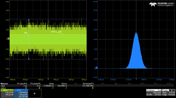 對于 MultiGBase-T1,抖動是在不同條件下測量的。 前兩個稱為發射器定時抖動,是在 DUT 處于主配置或從配置時的 175 MHz 時鐘輸出上測量的。 下一個稱為傳輸 MDI 隨機抖動,它是在 DUT 發送類似于 175 MHz 時鐘信號的模式時在 MDI 接口上測量的。