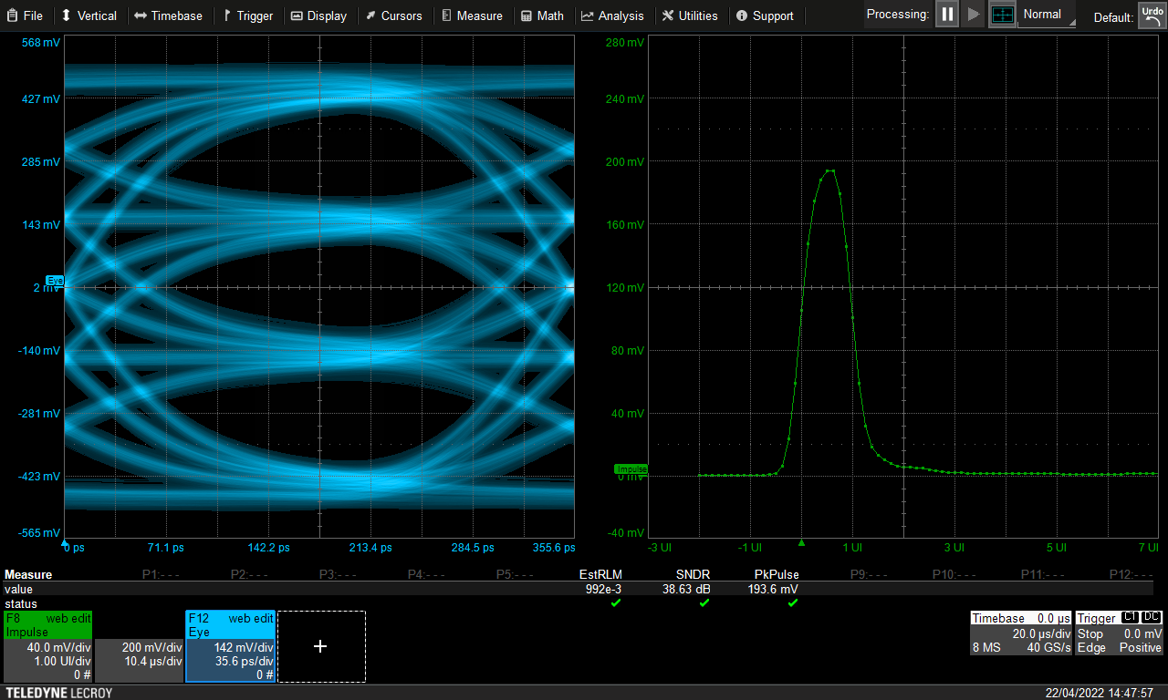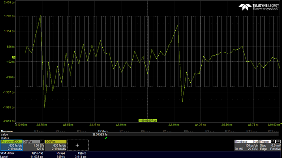 該測試使用兩種不同的模式和設置測量 MDI 接口上的確定性抖動。 第一個測試使用 JP03A 測試模式測量確定性抖動 (DJpk-pk),第二個測試使用 JP03B 測試模式測量偶奇抖動 (EOJpk-pk)。