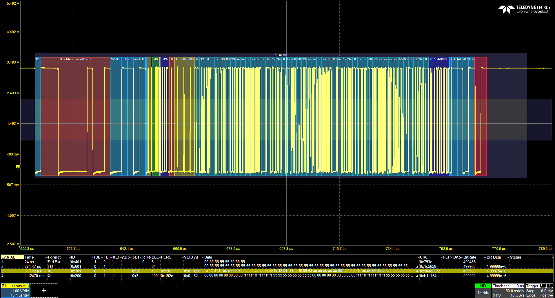 對每個協議的特定部分和整個消息幀使用彩色透明的疊加功能,便于理解您的串行數據信息。與其他解決方案不同,我們的解決方案將協議解碼信息遠離信號,直接在顯示器上關聯波形和協議解碼。隨著采集長度的擴大或縮短,解碼疊加層將進行調整,以顯示恰到好處的信息量