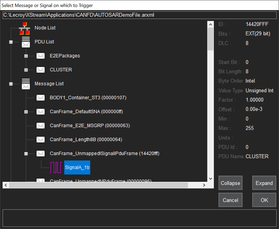 CAN Symbolic 選項支持使用客戶提供的 DBC 或 ARXML 文件來選擇觸發信號和 CAN to Value 串行數據 DAC 設置。 此外,解碼注釋也是符號格式,描述了完整的消息和信號結構。