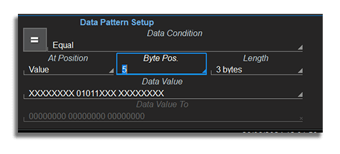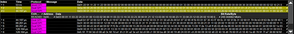 許多軟件架構的消息非常密集,單個消息的數據分布在多個數據字節中。我們的 QSPI 觸發工具集允許隔離一個或多個數據字節中的特定位級數據模式,例如,數據字節 18 和 26 中位 2-3 中的數據位置。這在隔離您需要的精確信息或行為方面具有顯著優勢。