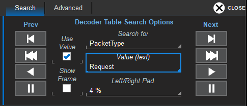 所有解碼都提供了通過使用各種搜索條件或值,或簡單地查找下一個事件來搜索解碼數(shù)據(jù)的長記錄的能力。 碼型搜索 自動創(chuàng)建所采集波形的縮放軌跡,并顯示帶有透明彩色疊加的選定位置。