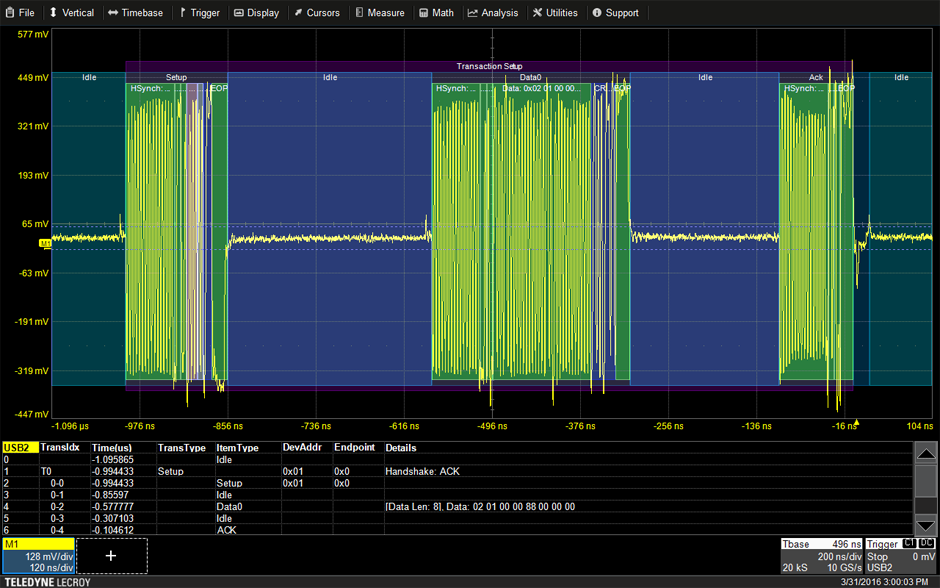 提供對任何類型的數據包(甚至是用戶定義的數據包)觸發的全面支持,在地址、端點、拆分類型、集線器、端口等方面具有完全的靈活性。在特定位置的特定數據負載上觸發。或單個觸發條件中的任意三個數據包。使用令牌、數據、握手和用戶定義的數據包的任何允許組合創建 USB 事務觸發器。像這樣的高級功能通常只能在專用的協議分析儀中找到!