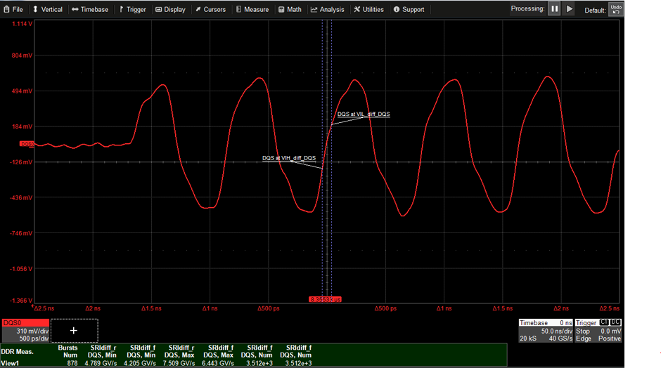 JEDEC 標準為 DDR4/LPDDR4/4X 定義的差分和單端轉(zhuǎn)換率測量寫入突發(fā)中的每個上升沿和下降沿。 QPHY-DDR4 將測量采集中每個寫入突發(fā)內(nèi)的每個轉(zhuǎn)換,在短時間內(nèi)提供大量統(tǒng)計結果。 在這張圖中,執(zhí)行了超過 3,000 次轉(zhuǎn)換率測量,以確保在不需要多次采集的情況下捕獲到真正的最大值和最小值點。