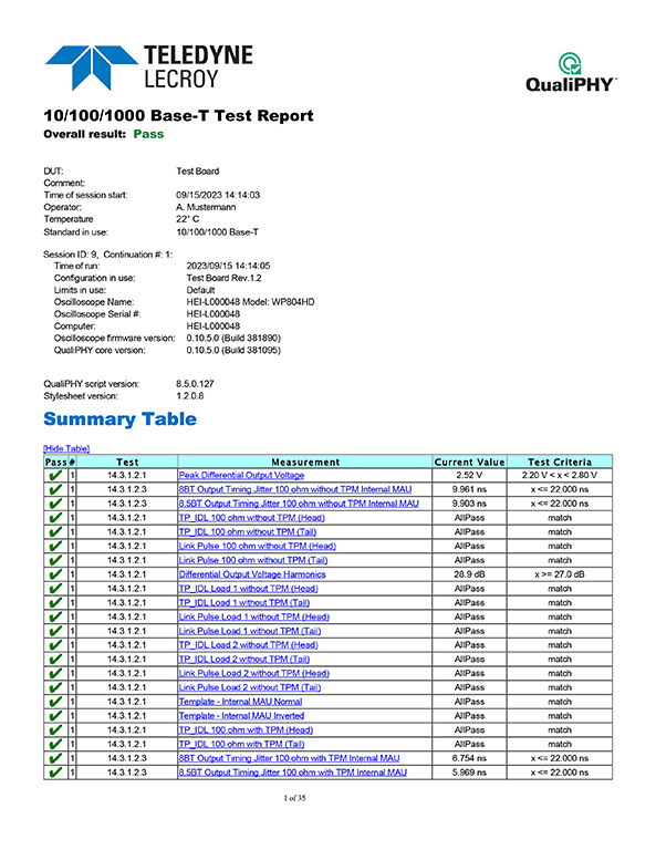 通常需要對測量結果進行匯總并制成表格,以快速驗證待測物。 這些信息與儀器和信號采集/測試條件設置一起形成完整的記錄。 QPHY-NBASE-T 通過合并自動 HTML 報告生成引擎簡化了此過程。 創建的測試報告包含每個單獨測試結果的表格數值,包括通過/失敗結果和測試門限。 報告還可以保存為 PDF、HTML 或 XML。