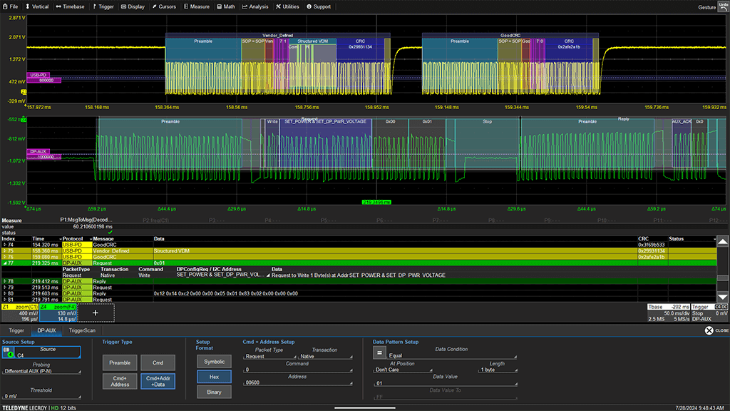 DisplayPort DP-AUX TDMP 可單獨用于標準 DP 連接器或 eDP 設計;或與 USB-PD TDMP 一起使用,以分析 DisplayPort over USB-C 設計中 DP-AUX(SBU 線路)和 USB-PD(CC 線路)之間的時序。Msg-Msg 時序測量可用于調試由 USB-PD Alt Mode 事務和 DisplayPort AUX 鏈路訓練之間的時序不當引起的系統互操作性問題。