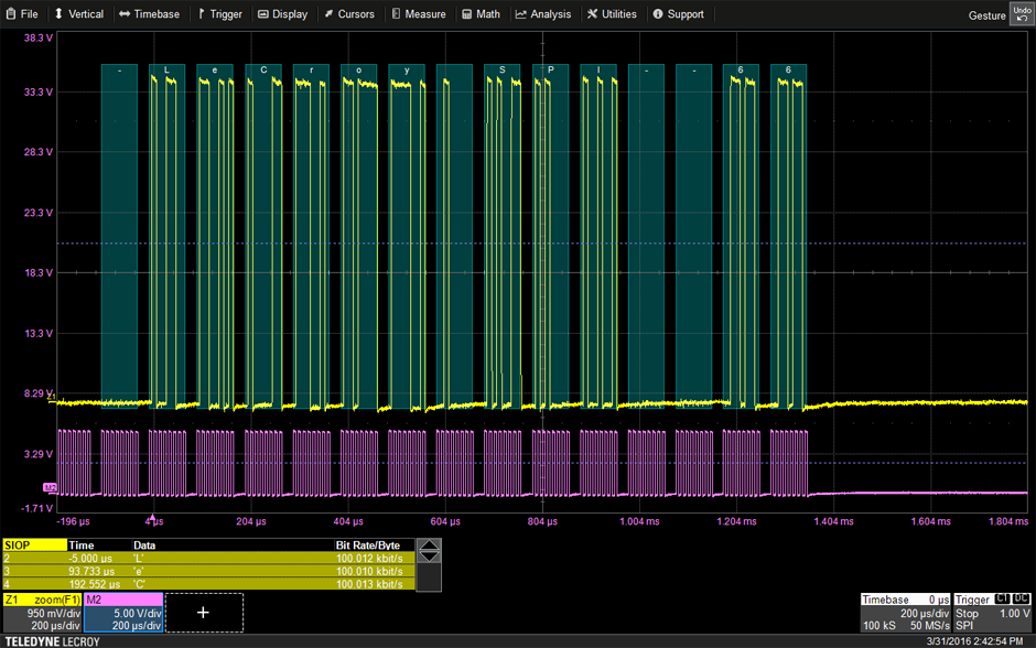 對每個協議的特定部分和整個消息幀使用彩色透明的疊加功能,便于理解您的串行數據信息。與其他解決方案不同,我們的解決方案將協議解碼信息遠離信號,直接在顯示器上關聯波形和協議解碼。隨著采集長度的擴大或縮短,解碼疊加層將進行調整,以顯示恰到好處的信息量