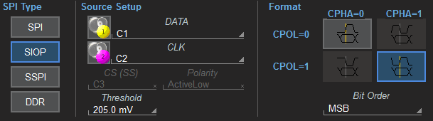 大多數 SPI 觸發器要求存在一個片選信號。 但是簡化的(單主單從)SPI(也稱為 SSPI 或 SIOP)沒有片選信號。 我們的解決方案仍然允許通過使用幀間設置時間觸發簡化的 SPI。 大多數情況下,AUTO 默認值提供準確的結果,但也可以使用 MANUAL 選擇。