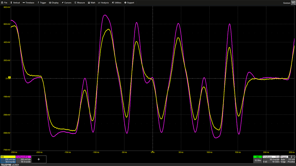 集成到軟件中的均衡器能夠解碼實時信號(黃色),并允許模擬真實的接收器行為(紫色)。 主站和從站的參數可以分別設置。 加上雙向耦合器效應補償的可能性,可以再現實際系統中的條件。