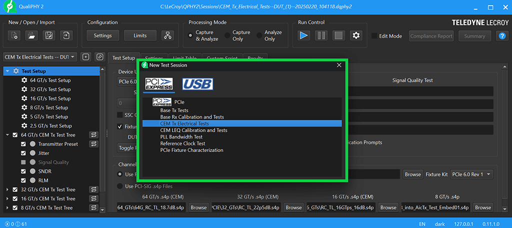 PCI-SIG 定義了一套標準的 CEM 合規性測試,設備需要通過這些測試才能獲得認證,并且每項測試都有其獨特的要求。QPHY2-PCIE1-PCIE2-TX 提供了正確執行測試的分步指南。然后,配置儀器、執行測試并記錄結果。