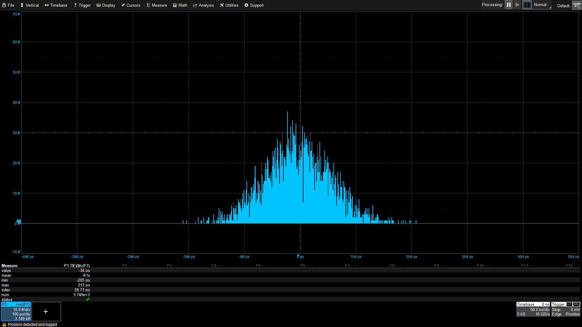 當 DUT 處于測試模式 1 時,將測試傳輸器主控定時抖動定時。測量 TIE,并使用 TIE 值的范圍來計算峰峰值 TIE 抖動。