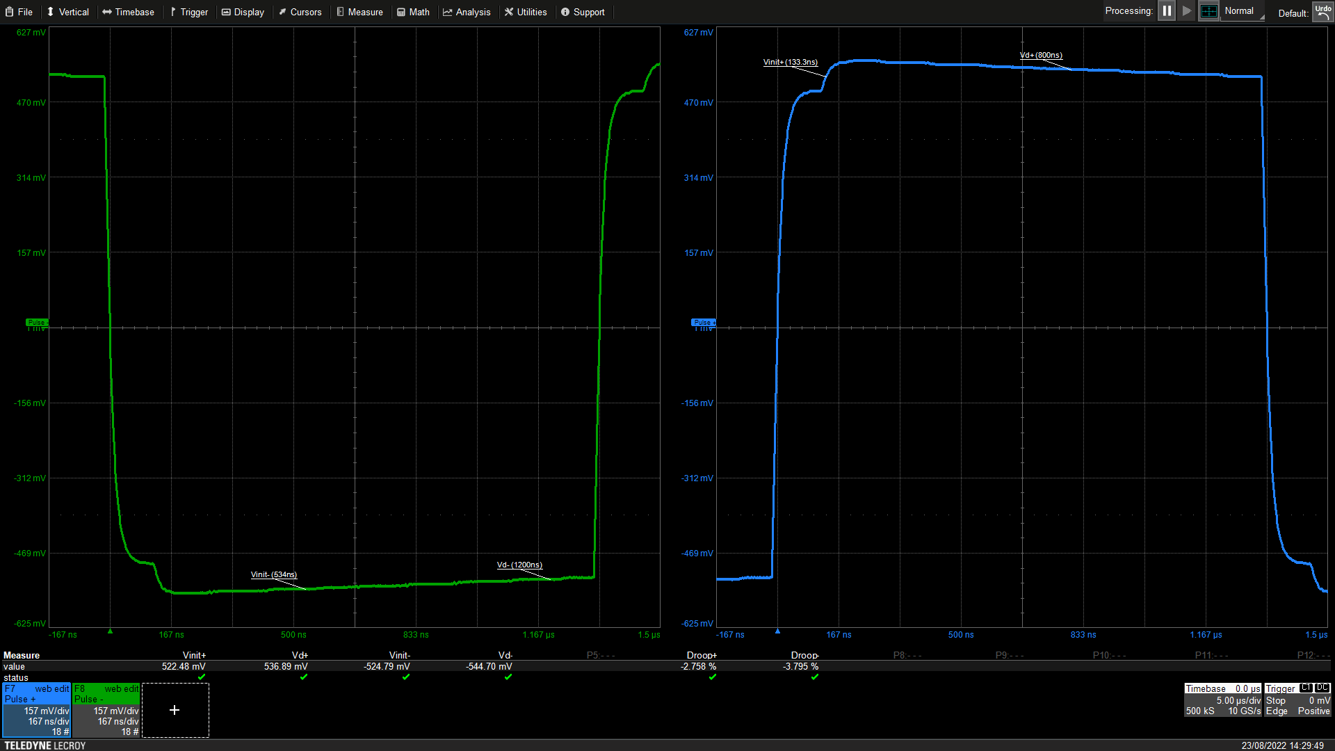 輸出壓降是根據測試模式 2 波形中的正符號和負符號計算的。 相對于過零后的初始峰值(由 Max 和 Min 參數表示)和初始峰值后 800 ns 的值測量下降幅度。