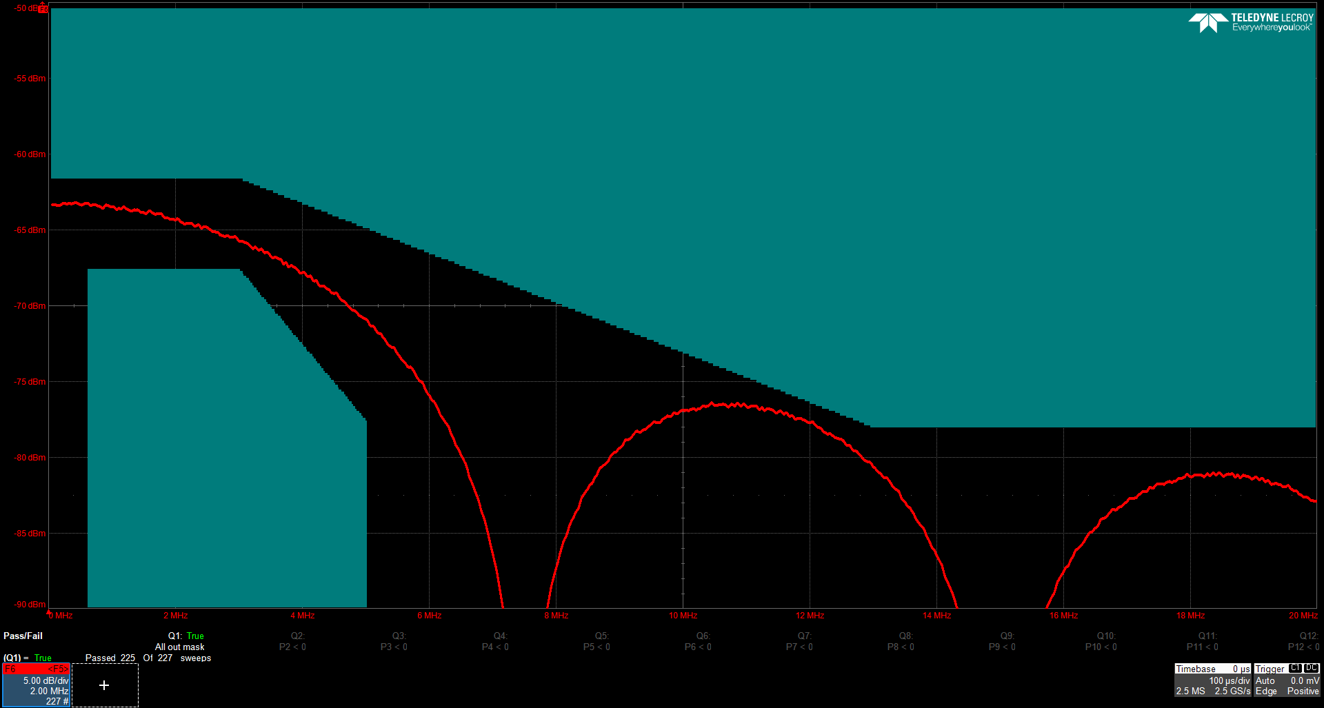 當 DUT 正在發射測試模式 3 時,發射機的功率譜密度 (PSD) 將根據模板定義的指定限制進行測試。使用示波器進行 PSD 測試無需購買頻譜分析儀。