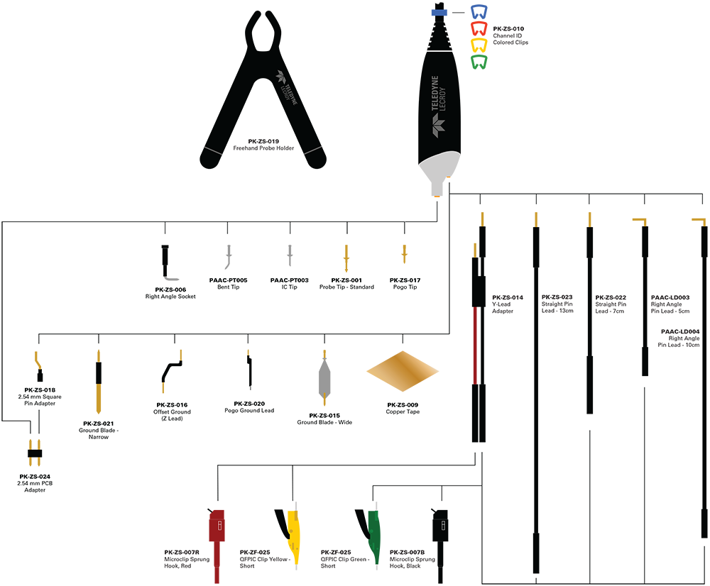 ZS 系列探頭的小尺寸和廣泛的標配可選尖端附件確保該探頭能夠應對任何困難的探測挑戰。 各種柔性引線和夾子,例如直角引線、Y 型適配器和探鉤,使之可用于探測間隔較遠的測試點。