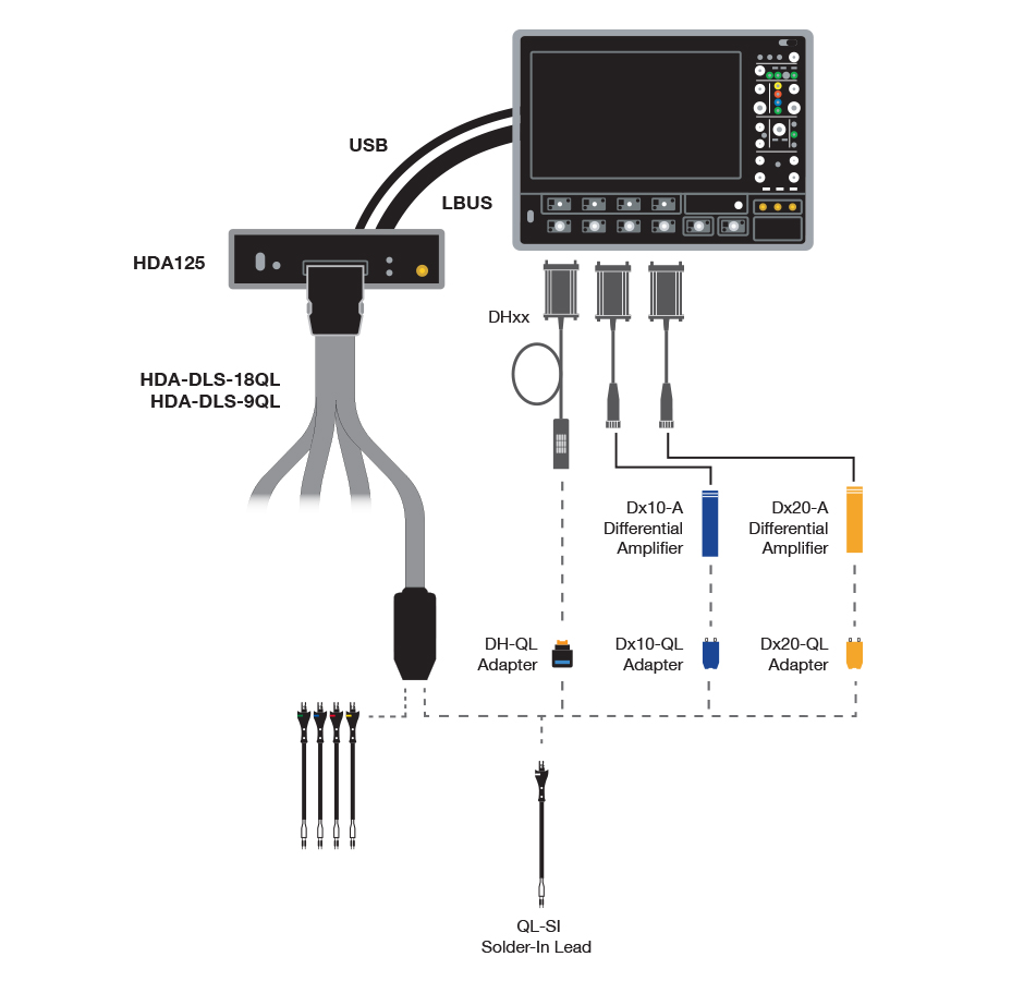 DH-QL適配器可以將QuickLink焊接探頭尖端與任何DH系列探頭配合使用。對于嵌入式系統的驗證和調試,這些探頭可以用于DH系列探頭的模擬探測以及HDA125高速數字分析儀的數字采集。