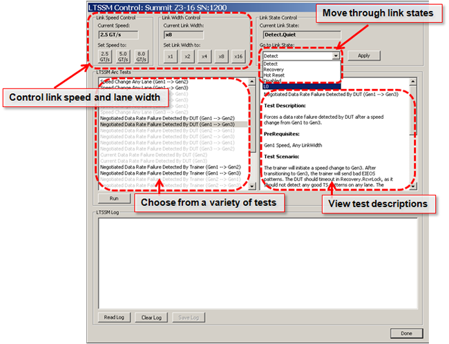 直觀的軟件控制將復雜的分析功能與易用性融為一體,允許根據特定的產品要求快速定制測試套件。 有助于對 PCIe 鏈路進行故障排除的眾多功能之一是執行 LTSSM 狀態轉換的能力。 強大的腳本語言允許以 3 GT/s 的 Gen8 數據速率創建事務層數據包 (TLP) 和數據鏈路層數據包 (DLLP)。 可以在用戶控制下生成 ACK 或 NAK。 用戶未明確指定的數據包字段是自動生成的(例如 CRC)。 可以為任何設備模擬配置空間,包括端點、網橋和交換機。 對 Gen1 (2.5 GT/s) 和 Gen2 (5 GT/s) 數據速率的支持允許鍛煉者生成測試用例,以測試設備與其他設備自動協商數據速率的能力。
