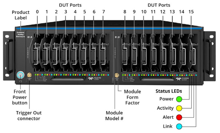 OakGate PCIe 5.0 16盤位外置盒,適用于EDSFF E1短款25毫米硬盤(單端口/雙端口模式)/ 因硬盤厚度限制,每隔一個插槽僅支持最多8個被測設備(DUT)同時加載
